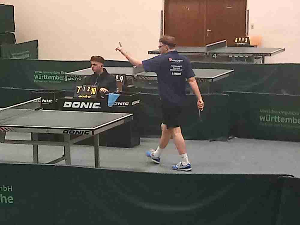 Finn Zeil bewies auch im Einzel seine Klasse. Nach zwei gewonnen Sätzen lag er im dritten auf einmal mit 6:9 im Rückstand. Aber auch er konnte das Spiel drehen und gewann mit 12:10. Noch kaltblütiger war er in seinem zweiten Einzel. Die beiden ersten Sätze hat er gewonnen (14:12 und 12:7), den dritten verloren und im vierten lag er auch schon mot 6:10 zurück. Doch auch das konnte er erfolgreich zum 12:10 drehen.