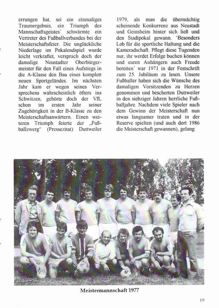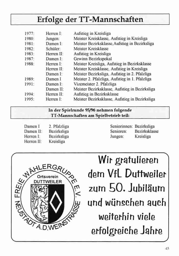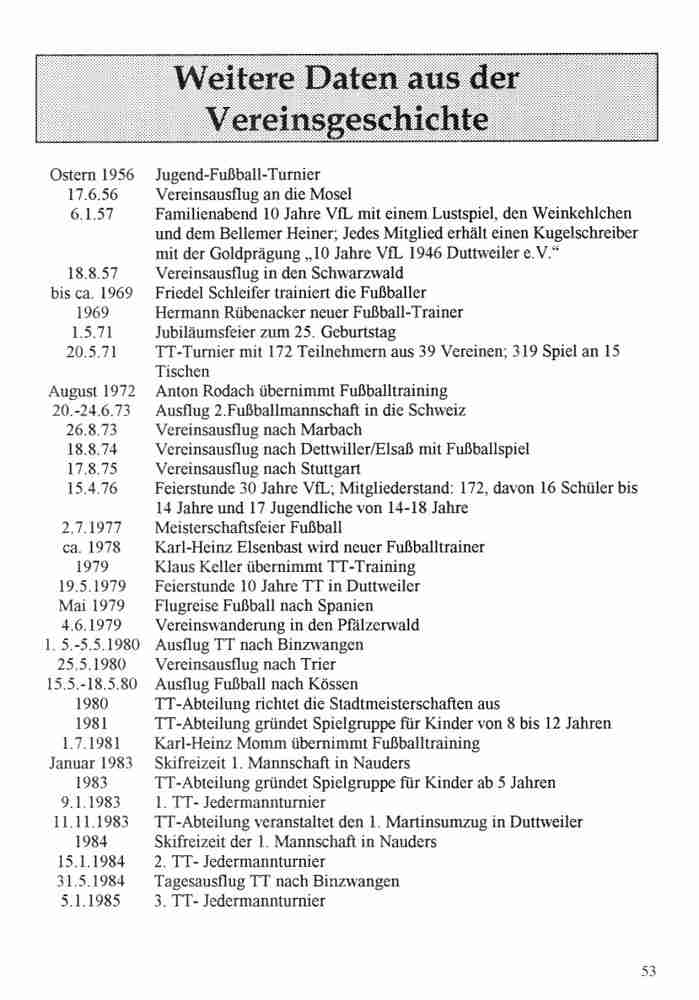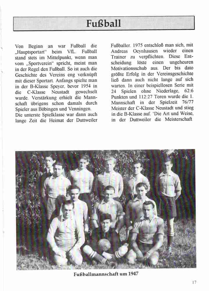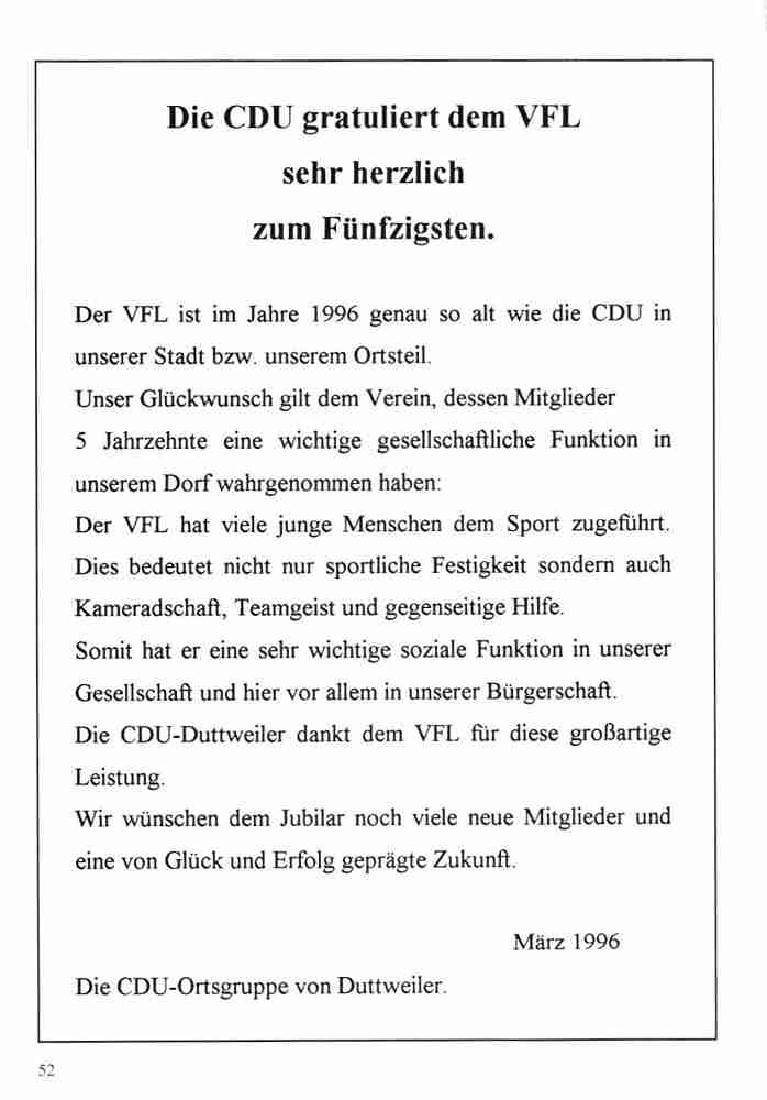 Im Jahr 1996 wurde der VfL Duttweiler 50 Jahre alt. Neben vielen Festveranstaltungen hat der Verein auch eine Festschrift herausgegeben.