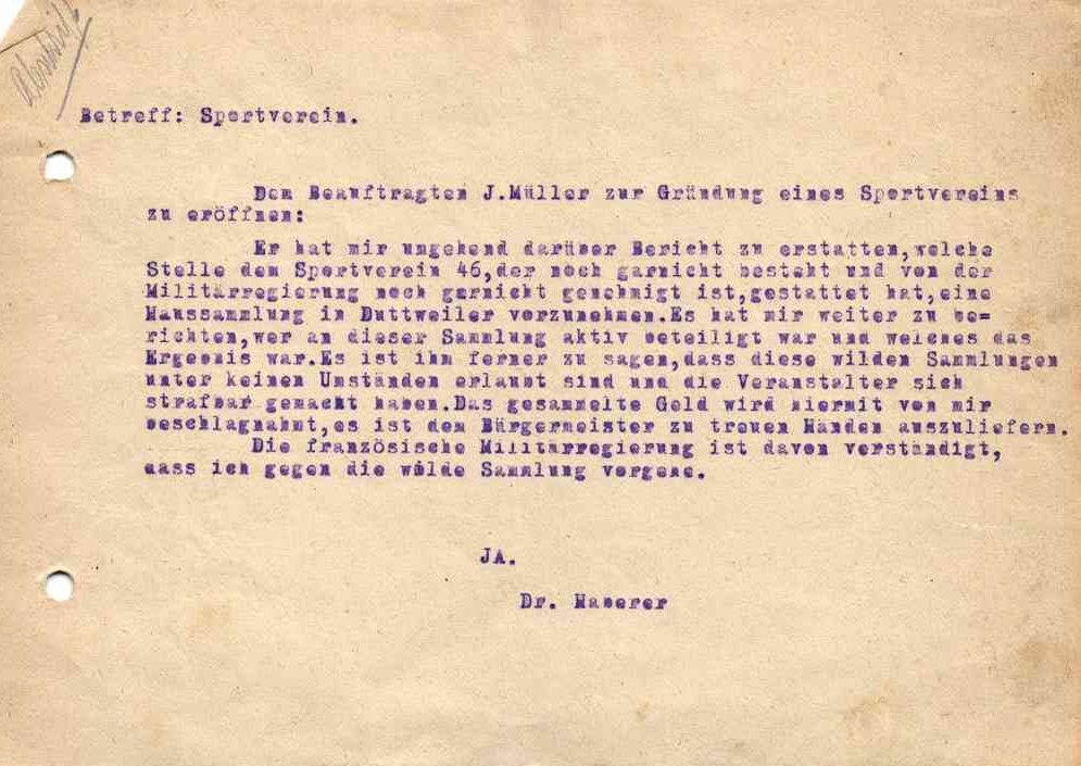 In einer Notiz beauftragt der Landrat den Bürgermeister, ihm Bericht über den noch nicht gegründeten Sportverein zu erstattet.Ferner beschlagnahmt er das gesammelte Geld und bittet den Bürgermeister es treuhänderisch aufzubewahren.