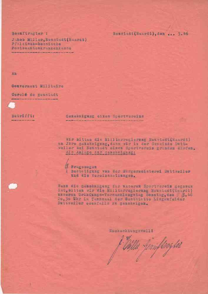 In einem Schreiben an die französische Militärregierung in Neustadt bittet der Sportvereins-Beauftragte Jakob Müller um die Genehmigung des Sportvereins und weiterhin um die Genehmigung der Gründungsversammlung am 9.6.46 im Saal Lingenfelder.
