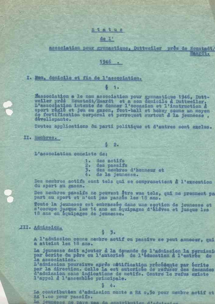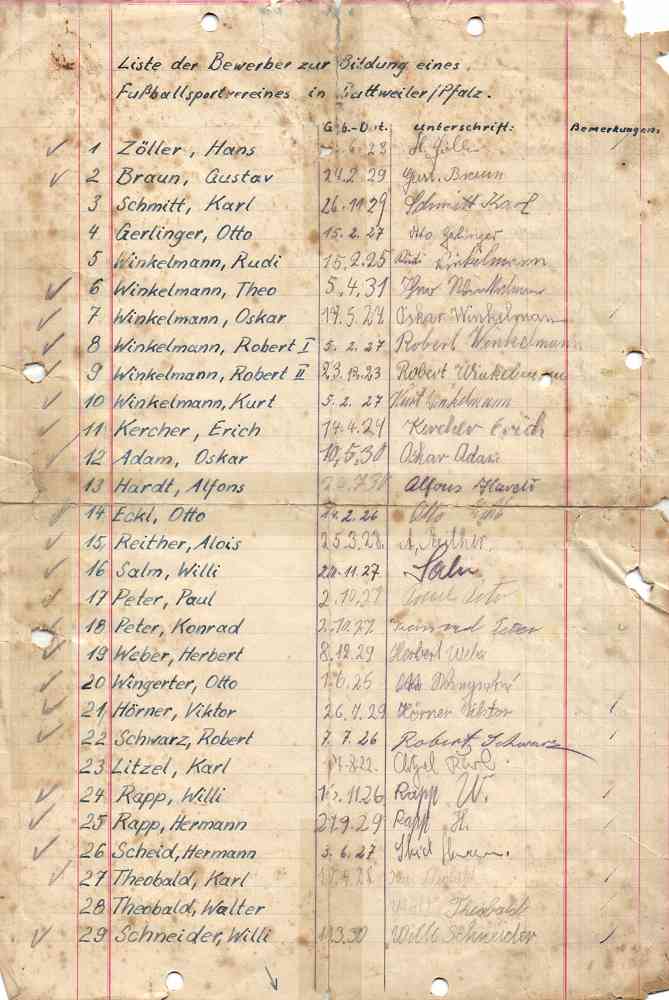 Das Datum wird in einem Schreiben ( Dissonanzen bei Vereinsgründung)an den Landrat genannt sowie zwei weiteren Schreiben an den Bürgermeister un den Ortskommandanten der Militärregierung genannt. Es existiert eine undatierte Liste von Bewerbern, diese waren vermutlich die Anwesenden bei der Versammlung. Von der ersten Satzung existiert außerdem noch eine Fassung in französischer Sprache.